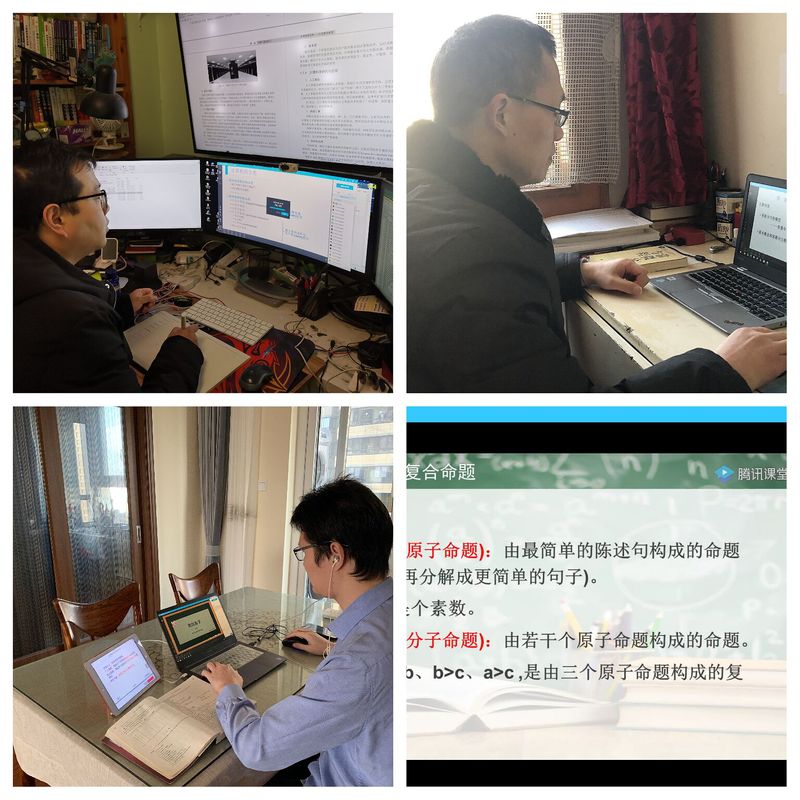先看看计算机老师的技术范。朱兆松老师的书房简直就是实验室的节奏,多屏幕的切换,配置了手写板,这些都为“线上教学”提供了便利。装备的多样、先进极大保障了线上教学的有序性和趣味性,但是朱老师仍然觉得压力比较大,对他来说这是一次挑战。朱老师说:线上教学的实时性,意味着课前准备要更加充分、材料要更加丰富与多样化,对老师来说是磨炼;平台具有回放功能,员工能够复习,老师也能复课,可以不断挖掘自己教学过程中的问题,进一步提高教学水平和质量;但线上教学互动环节不够直接,相比线下教学效率稍低。