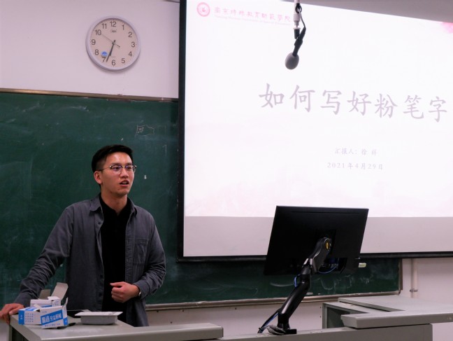 赛前培训中,金诚立老师和徐祥老师结合自身所学,教授同学们汉字书写方法,并结合钢笔字、粉笔字书写中容易出现的问题,为同学们答疑解惑。