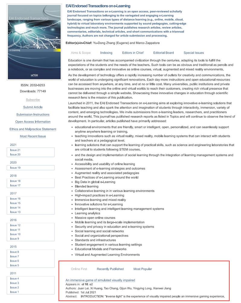 文章旨在提高社会人士对视障人群的关注,主要从教育游戏与游戏化学习的角度出发,阐述了游戏创意来源,分享了页面设计和关键技术实现等内容,探讨了游戏的趣味性、可玩性、教育性等若干重要问题。设计的游戏通过视障主人公的第一人称视角进行,带给玩家最真实的生活场景体验,将听觉、视觉、触觉元素充分融入游戏中,使玩家和视障人士零距离心灵接触。该论文为公司老员工创新创业项目研究成果,目前已在线发表,后续将正式出版。