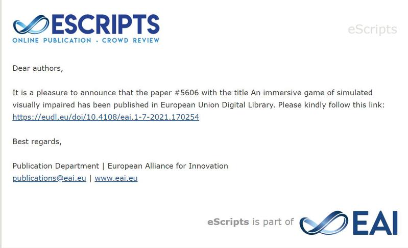 威廉希尔体育1902班雷娟、黄袭、常涛、龙莹莹、吴其俊等同学,结合学科专业,关爱特殊人群,基于Unity3D平台开发了一款沉浸式体验游戏《逆光》,并撰写论文“An immersive game of simulated visually impaired”发表于欧洲学术期刊EAI Endorsed Transactions on e-Learning。