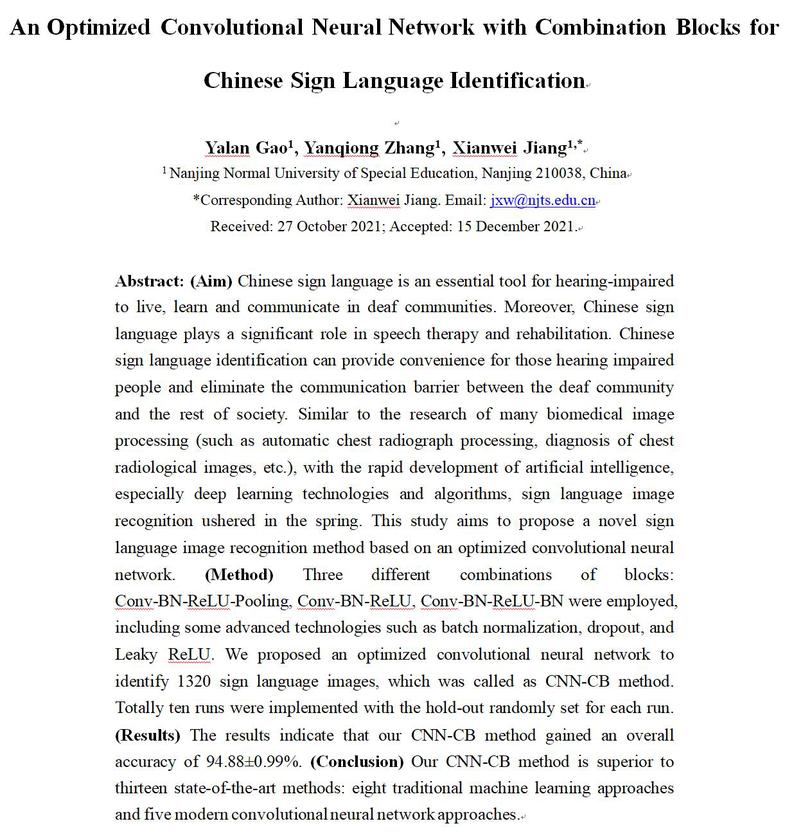 该论文提出了一种基于优化卷积神经网络的新型手语图像识别方法,采用三种不同的块组合,融入BatchNormalization、Dropout和Leaky ReLU等流行技术,对1320幅手语图像进行分类识别,获得了94.88±0.99% 的整体准确度,优于对比的十三种先进方法。该论文也是威廉希尔体育教师国家社会科学基金项目(Grant No. 20BTQ065 )---“基于手语词汇语料库的语义知识挖掘研究”子课题研究成果之一。