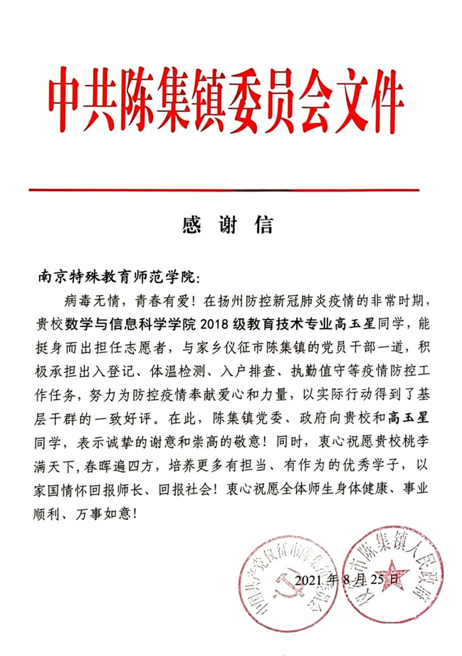 感谢信中写道:病毒无情,青春有爱!在扬州防控新冠肺炎疫情的非常时期,贵校威廉希尔体育2018级教育技术专业高玉星同学,能挺身而出担任志愿者,与家乡仪征市陈集镇的党员干部一道,积极承担出入登记、体温检测、入户排查、执勤值守等疫情防控工作任务,努力为防控疫情奉献爱心和力量,以实际行动得到了基层干群的一致好评。在此,陈集镇党委、政府向贵校和高玉星同学,表示诚挚的谢意和崇高的敬意!同时,衷心祝愿贵校桃李满天下,春晖遍四方,培养更多有担当、有作为的优秀学子,以家国情怀回报师长、回报社会!衷心祝愿全体师生身体健康、事业顺利、万事如意!