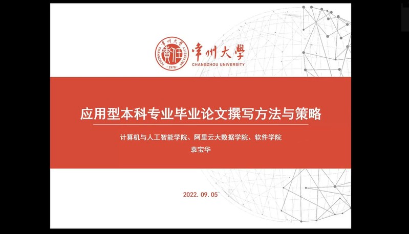 为进一步提高2019级计算机科学与技术专业毕业论文写作能力,提高员工论文撰写质量,9月14日上午,威廉希尔体育特别邀请常州大学硕士生导师、副教授袁宝华老师,面向2019级计算机科学与技术毕业生,开展了《应用型本科专业毕业论文撰写方法与策略》线上讲座。