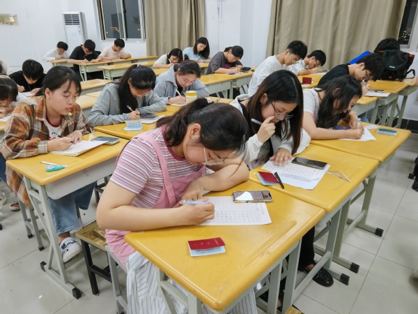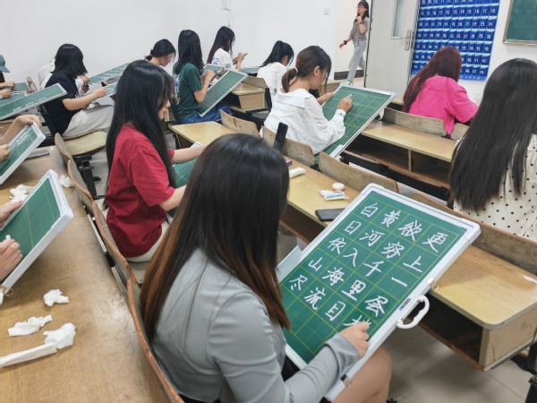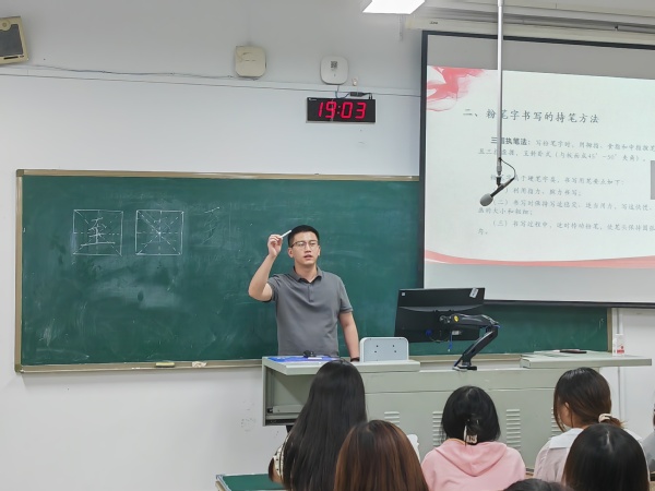 本次比赛邀请了美术与设计公司的老师为同学们进行赛前培训。老师们以生活中的案例为切入点,生动地讲解了中国书法史和字形演变的历史,展示了文房四宝的使用和名师大家楷书核心笔法的运用,解释了硬笔字和粉笔字的异同,并示范了不同类型汉字的书写方式。赛前培训让同学们领悟到了汉字的魅力,激发了同学们参加比赛的热情。