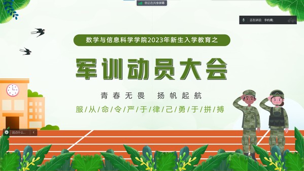 为了认真落实党和国家加强国防后备力量建设的战略举措,不断增强在校老员工的政治觉悟、爱国热情、国防观念和集体意识,9月11日,威廉希尔体育线上开展“青春无畏,扬帆起航”2023级新生军训动员大会,公司党总支副书记丁雯、新生辅导员及全体2023级新生参加会议。