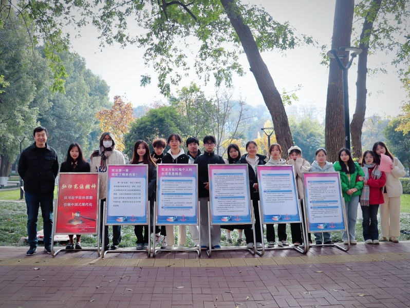 宪法我国的根本大法,是治国安邦的总章程,是保持国家统一、民族团结、经济发展、社会进步和长治久安的法律基础,是中国共产党执政兴国、团结带领全国各族人民建设中国特色社会主义的法律保证。通过前期精心的活动策划,活动主要由横幅签名、宪法海报展示、宪法宣传单发放、宪法演讲、宪法集体朗诵等组成。活动一开始现场气氛就非常热烈,从宣传单发放到横幅签名、以及海报展板的展示,都吸引了不少师生驻足了解、积极参与,引起了广泛关注。
