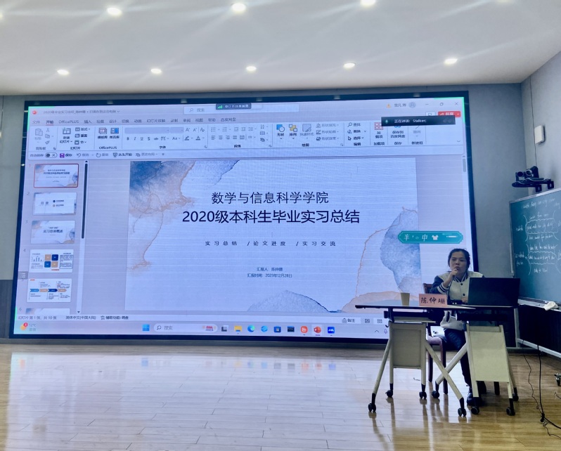 在优秀实习生代表发言环节由2004班曹颖作交流发言,她全面细致地分享了自己在实习期间的诸多收获和感受。从如何钻研教材、分析学情、设计教学、研究板书与多媒体应用备好课,到如何模拟授课、关注学情、师生互动、突出员工主体性上好课,再到如何高效地听课评课以及做好班主任工作,她如数家珍地讲述了实习期间的成长和见闻。她以“纸上得来终觉浅,绝知此事要躬行”的实践指引高质量地完成各项实习工作,并为大家带来一场精彩的分享报告。