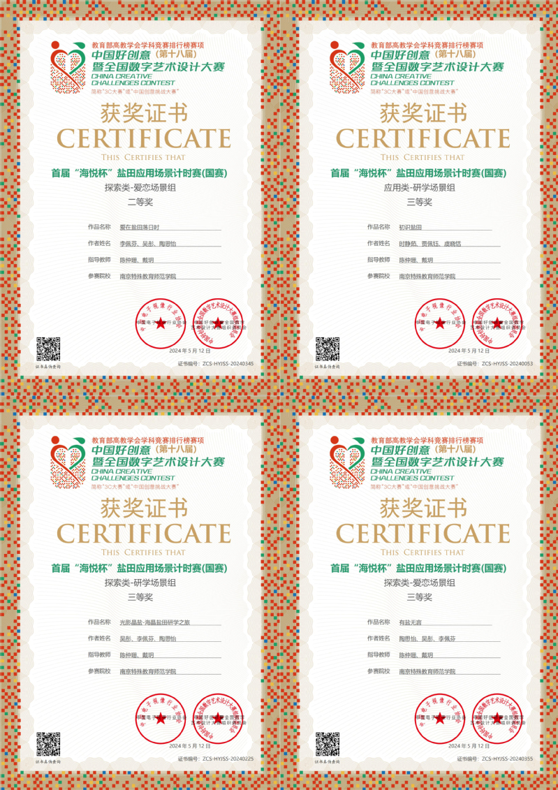 近日,首届中国好创意“海悦杯”中国好创意盐田应用场景72小时计时赛(国赛)在天津开赛。数学与信息科学学院陈仲珊老师和戴玥老师指导的由时静茹、吴彤、贾佩钰、李佩芬和陶思怡等6名员工组建的2支团队参加了本次国赛。代表队作品《爱在盐田落日时》在众多本科院校中脱颖而出,喜获探索类爱恋场景国赛二等奖;作品《初识盐田》喜获应用类研学场景组国赛三等奖;作品《有盐无言》喜获探索类爱恋场景组国赛三等奖;作品《光影晶盐-海晶盐田研学之旅》喜获探索类研学场景组国赛三等奖。
