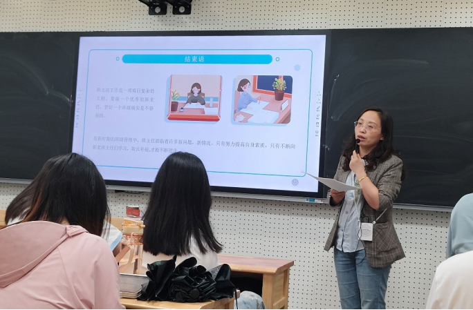 观摩课程结束后,王雅静和王俊贤老师分别为同学们带来了两场讲座。王雅静老师从班主任的角度,围绕“教学管理:中学教师教学管理”主题,讲授了班主任应具备的教育理念。她强调,班主任需要增强管理意识、学会换位思考、赏识和宽容员工,努力创造良好的班风和学风。王老师通过实例分享了许多管理技巧和经验,鼓励师范生们不断提高自身素质,虚心学习其他班主任的长处,取长补短,不断进步。王俊贤老师则从“特色课堂与教育理念及教学研究”的角度,详细介绍了公司的课程内容、“四立课堂”教学实践及其成果。他强调,教育不仅仅是知识的传授,更是对员工综合素质的培养。通过具体的案例和实践经验,王老师鼓励各位同学积极参与教学实践,亲身感受教育的魅力。