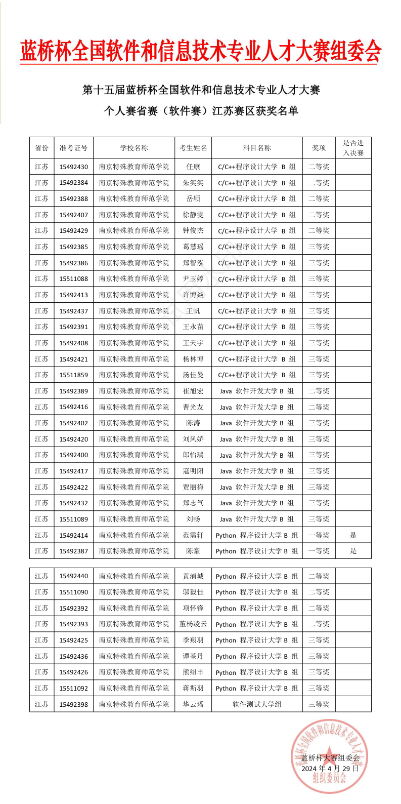 近日,全国第十五届蓝桥杯全国软件和信息技术专业人才比赛落下帷幕。公司公司员工个人及团队在此次赛事中取得了全国赛获奖10项、江苏省赛获奖80项的优异成绩。喜人的成绩取得受益于公司的高质量发展战略谋划和对人才培养的持续重视。尽管备赛过程周期比较长,但教师们始终辛勤付出、认真指导,员工积极准备、持续投入,比赛中展现出南京特师学子的优秀品质和良好的竞赛精神。蓝桥杯全国软件和信息技术专业人才大赛是由工业和信息化部人才交流中心举办的全国性IT学科赛事,吸引着北京大学、清华大学、上海交通大学等全国1200余所高校参赛,是高校公司产品改革和创新人才培养的重要竞赛项目。