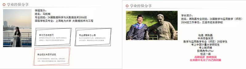 在学长学姐交流分享环节,邀请到了公司数据科学与大数据技术2006班现就读于上海电力大学大数据技术与工程的研究生马凯楠和公司数学与应用数学(师范)2004班现工作于兰溪市延安路公司的蒋陈磊通过腾讯会议分享考研、考编经验。他们毫无保留地分享学习方法、规划思路,从院校专业选择、复习计划制定、备考心态调整等方面进行了详细讲解。他们建议大家要尽早确定目标院校,并针对性地收集历年真题和复习资料,进行系统性的复习。除了学习方法,学长学姐们还分享了他们在备考过程中遇到的困难和挑战,以及如何克服焦虑、保持积极心态的经验。学姐、学长的分享为有考研意向的同学指明方向,也为其他同学的学习成长提供了良好的经验。