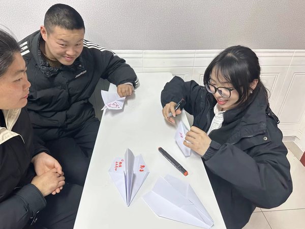 活动开始,志愿者们耐心引导学员们一起折纸飞机并绘图装饰,小小的纸张在大家的巧手下化作承载梦想与欢乐的纸飞机。随后,趣味竞赛将现场气氛推向高潮,学员们踊跃参与,每一个专注的神情、每一次努力的投掷,都充分展现出他们对生活的热爱和积极向上的态度。