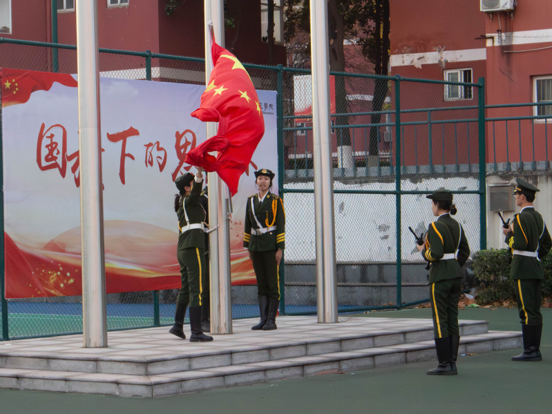 迎着蓬勃朝阳,国旗护卫队步履坚定,目光熠熠,护送国旗入场。庄严神圣的《义勇军进行曲》响起,师生们注视着国旗缓缓上升,眼神诚挚而热烈,雄壮有力的国歌声响彻校园。