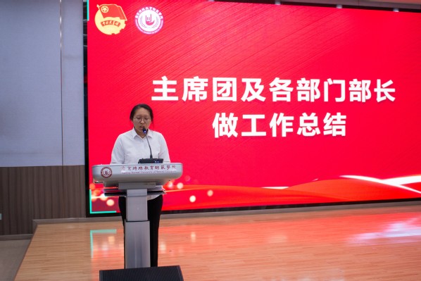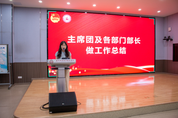 颁奖仪式结束后,主席团与各部门做工作总结。在发言中,员工会轮值主席孙琎首先对全体员工会成员的辛勤付出表示衷心感谢。她回顾了过去一学年员工会开展的各项工作,包括成功举办校园运动会和组织志愿服务活动等重要工作。她特别指出,在全体成员的共同努力下,员工会在服务同学、丰富校园文化生活等方面取得了显著成效。最后,孙琎表示相信在大家的共同努力下,员工会工作必将取得新的更大成绩。各部门部长依次系统梳理了本学期部门工作的开展情况,重点展示了在活动组织、志愿服务、宣传创新、文体活动等方面取得的显著成果,通过详实的数据和生动的案例,充分展现了工作亮点与特色创新。在总结工作成果的同时,也对员工会全体成员的辛勤付出给予高度评价,特别表扬了同学们在活动策划、执行过程中展现出的责任心、创造力和团队协作精神。正是大家的积极参与和努力工作,才使得各项活动得以顺利开展并取得优异成绩。